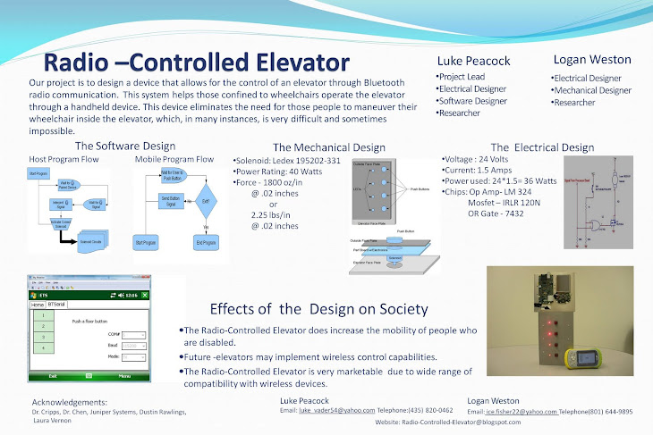 To meet the needs described above, we designed and built an apparatus that was a working prototype of our design. Our design allowed the elevator to be operated both manually and remotely via a Bluetooth radio signal. Every elevator is unique so our design was applied specifically to the elevator in the Utah State University Engineering Building.